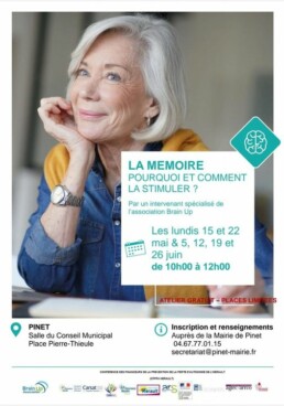 La Mairie de Pinet en partenariat avec l'association Brain Up vous propose des ateliers mémoires gratuits les lundis 15 et 22 mai et les 5, 12, 19 et 26 juin de 10h à 12h dans la salle du Conseil Municipal en Mairie.