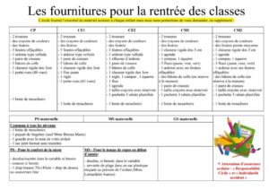 FOURNITURES RENTRÉE SEPTEMBRE Veuillez trouver la liste des fournitures scolaires pour la rentrée de septembre. En attendant nous souhaitons à l’ensemble des enfants, des enseignants et à l’ensemble du personnel scolaire un bel été et de belles vacances. PrécédentSuivant